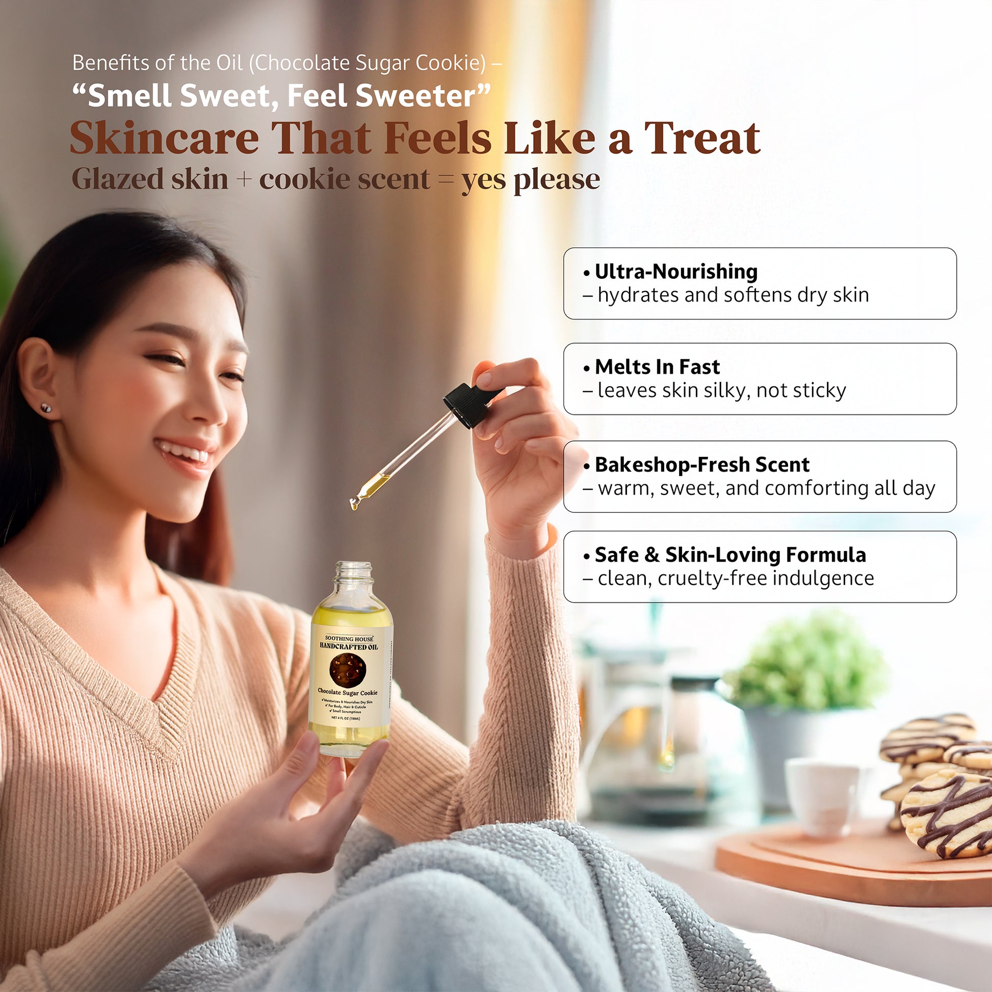 Chocolate Sugar Cookie Body Oil: A rich, sugary cookie delight. Infused with the comforting scent of baked dough, creamy vanilla, and melted chocolate, this oil leaves your skin feeling incredibly soft, smooth, and deeply moisturized.