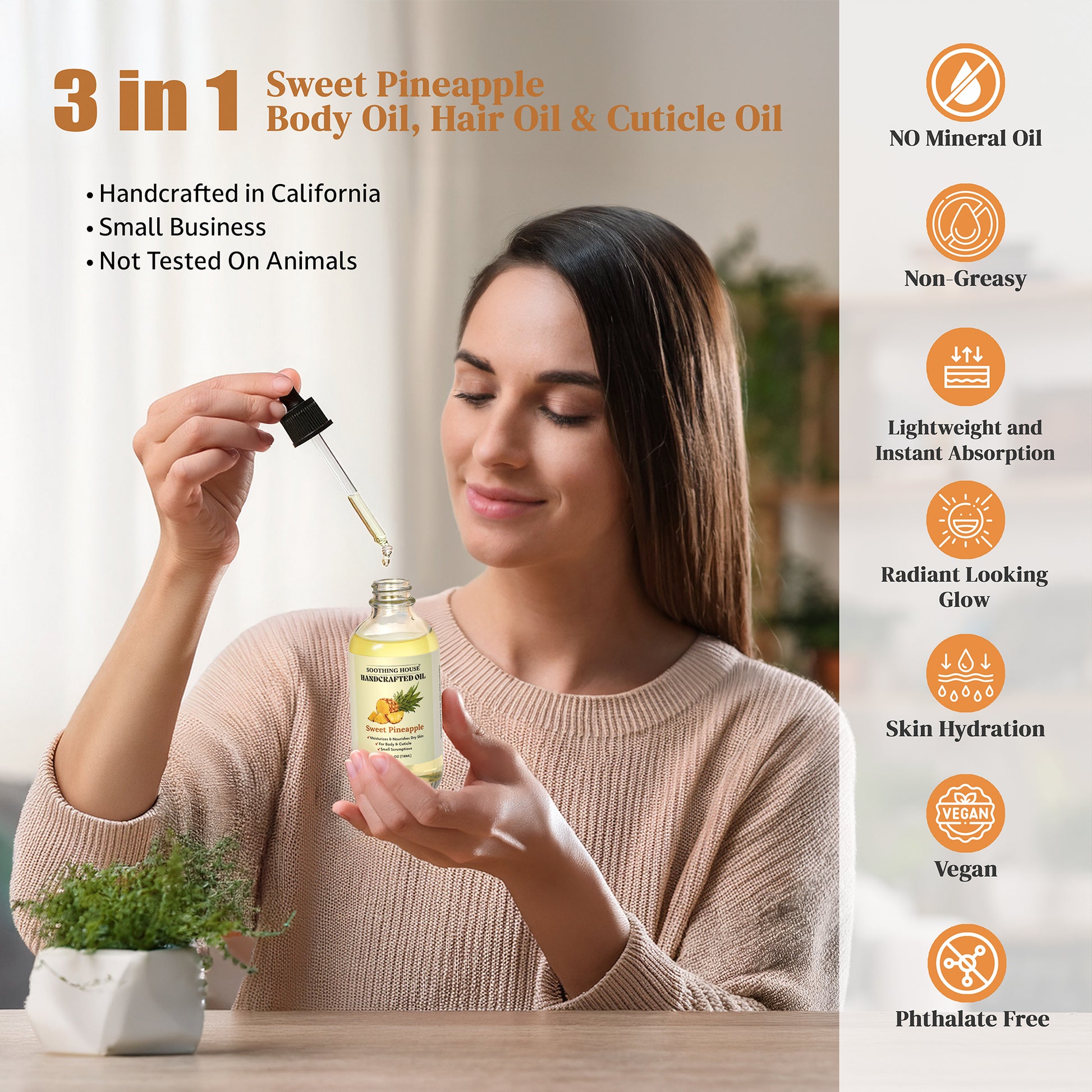 Get ready to "Glow Like You Just Left the Beach" with our Sweet Pineapple Body Oil. This handcrafted, 3-in-1 formula for body, hair, and cuticles is designed for ultra-light, non-greasy hydration.